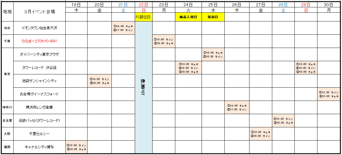 ※荒天、災害、交通事情等により、当日のリリースイベントが中止になる場合がございます。