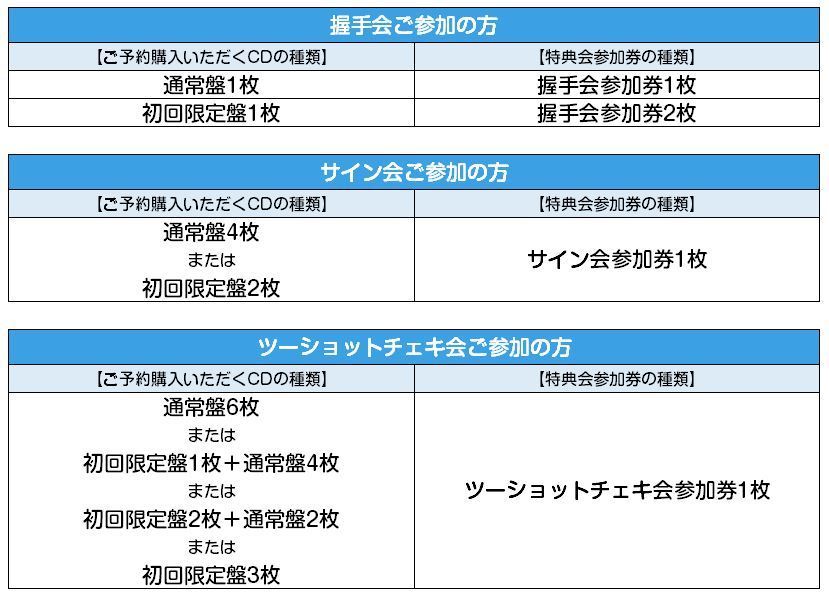 「特典会参加券」は「握手会参加券」「サイン会参加券」「ツーショットチェキ会参加券」の3種類ございます。